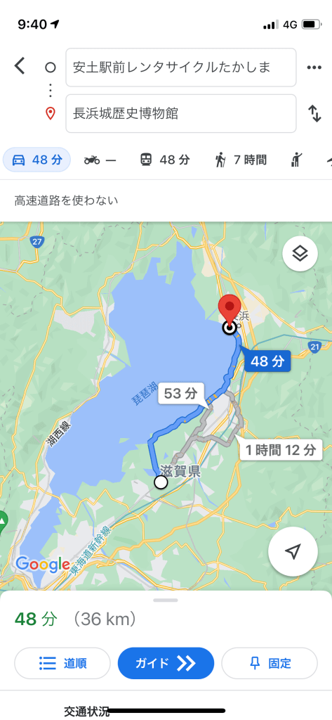 まず一旦レンタサイクルたかしまから、36km地点の長浜城を目指しました。